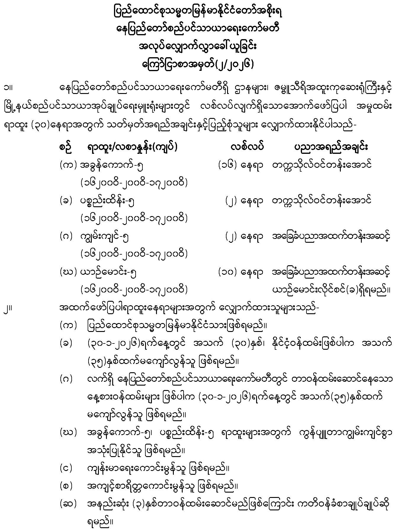 -------နေပြည်တော်၊ ဇမ္ဗူသီရိမြို့နယ်၊ သုခသိဒ္ဓိရပ်ကွက်၊ သုခတော်ဝင်အိမ်ရာရှိ တိုက်အမှတ် (U-3)၊ ပထမထပ်၊ အခန်း(12)အား အမည်ပေါက်ပိုင်ဆိုင်သူ ဒေါ်တင်မိုးခိုင်၊ နိုင်ငံသားစိစစ်ရေး အမှတ်၊ ၁၂/မဘန(နိုင်) ၁၀၂၀၀၉ ထံမှ လွှဲပြောင်းရယူထားသူ ဦးထက်လူဇော်၊ နိုင်ငံသားစိစစ်ရေး အမှတ်၊ ၈/ခမန(နိုင်) ၁၀၉၈၄၀ မှ အမည်ပေါက်ပြောင်းလဲပေးပါရန် လျှောက်ထားလာမှုအား တရားဝင်ခိုင်လုံသောအထောက်အထားများဖြင့် ဤကြော်ငြာစာပါသည့်နေ့မှစ၍ (၁၄)ရက်အတွင်း သုခတော်ဝင်အိမ်ရာစိစစ်နေရာချထားရေးဆပ်ကော်မတီသို့စာဖြင့်တင်ပြ၍ ကန့်ကွက်နိုင်ပါကြောင်း နှင့် ကန့်ကွက်မှုမရှိပါက လုပ်ထုံးလုပ်နည်းနှင့်အညီ ဆက်လက်ဆောင်ရွက်ပေးမည်ဖြစ်ပါကြောင်း အသိပေးကြေညာအပ်ပါသည်။