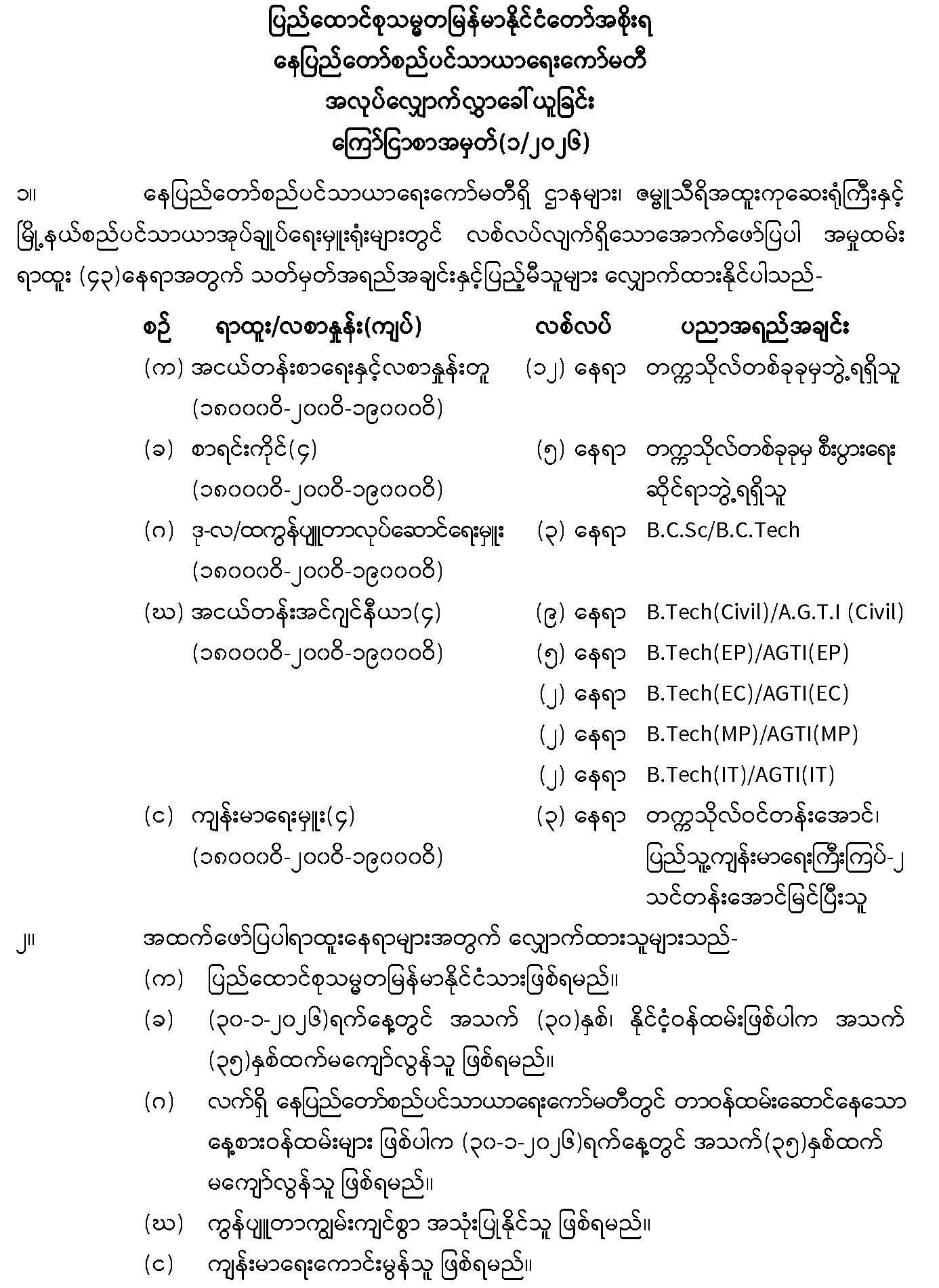 -------နေပြည်တော်၊ ဇမ္ဗူသီရိမြို့နယ်၊ သုခသိဒ္ဓိရပ်ကွက်၊ သုခတော်ဝင်အိမ်ရာရှိ တိုက်အမှတ် (C-11)၊ ဒုတိယထပ်၊ အခန်း(22)အား အမည်ပေါက်ပိုင်ဆိုင်သူ ဒေါ်မြင့်မာလာဝင်း၊ နိုင်ငံသားစိစစ်ရေး အမှတ်၊ ၁၂/ကမရ(နိုင်) ၀၄၉၉၄၄ ထံမှ လွှဲပြောင်းရယူထားသူ ဦးနေဇင်အောင်၊ နိုင်ငံသားစိစစ်ရေး အမှတ်၊ ၈/နမန(နိုင်) ၁၅၅၇၂၂ မှ အမည်ပေါက်ပြောင်းလဲပေးပါရန် လျှောက်ထားလာမှုအား တရားဝင်ခိုင်လုံသောအထောက်အထားများဖြင့် ဤကြော်ငြာစာပါသည့်နေ့မှစ၍ (၁၄)ရက်အတွင်း သုခတော်ဝင်အိမ်ရာစိစစ်နေရာချထားရေးဆပ်ကော်မတီသို့စာဖြင့်တင်ပြ၍ ကန့်ကွက်နိုင်ပါကြောင်း နှင့် ကန့်ကွက်မှုမရှိပါက လုပ်ထုံးလုပ်နည်းနှင့်အညီ ဆက်လက်ဆောင်ရွက်ပေးမည်ဖြစ်ပါကြောင်း အသိပေးကြေညာအပ်ပါသည်။