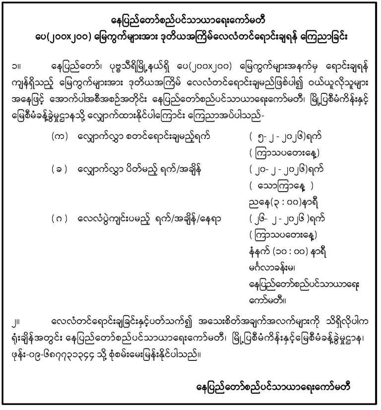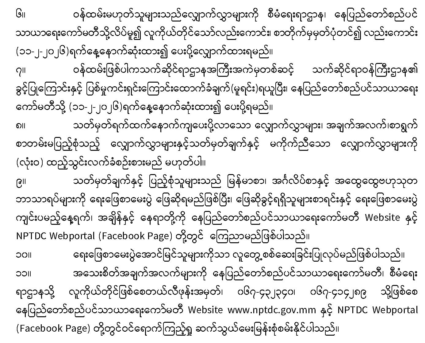 ၂။------- အဆိုပါအခမ်းအနားသို့ ဆိုင်ခန်းလျှောက်ထားသူများကို ကိုဗစ်-19 ကပ်ရောဂါ ကူးစက်မှု၊ အိုမီခရွန်ရောဂါများ ပြန့်ပွားမှုပြင်းထန်သည့် ကာလဖြစ်သောကြောင့် လူစုလူဝေး မဖြစ်စေရေးအတွက် ဖိတ်ကြားခြင်းမပြုတော့ဘဲ လျှောက်ထားသူများကိုယ်စား မဲနှိုက် ဆောင်ရွက်ပေးသွားမည်ဖြစ်ပြီး အခမ်းအနားကျင်းပနေမှုများအား နေပြည်တော်စည်ပင်သာယာရေး ကော်မတီ၏ NPTDC Webportal Facebook Page မှ တိုက်ရိုက်(Live)ထုတ်လွှင့်ပေးသွားမည် ဖြစ်ပါကြောင်းနှင့် မဲနှိုက်မည့် လျှောက်လွှာအမှတ်စဉ်များမှာ အောက်ပါအတိုင်းဖြစ်ကြောင်း အသိပေးကြေညာအပ်ပါသည်-