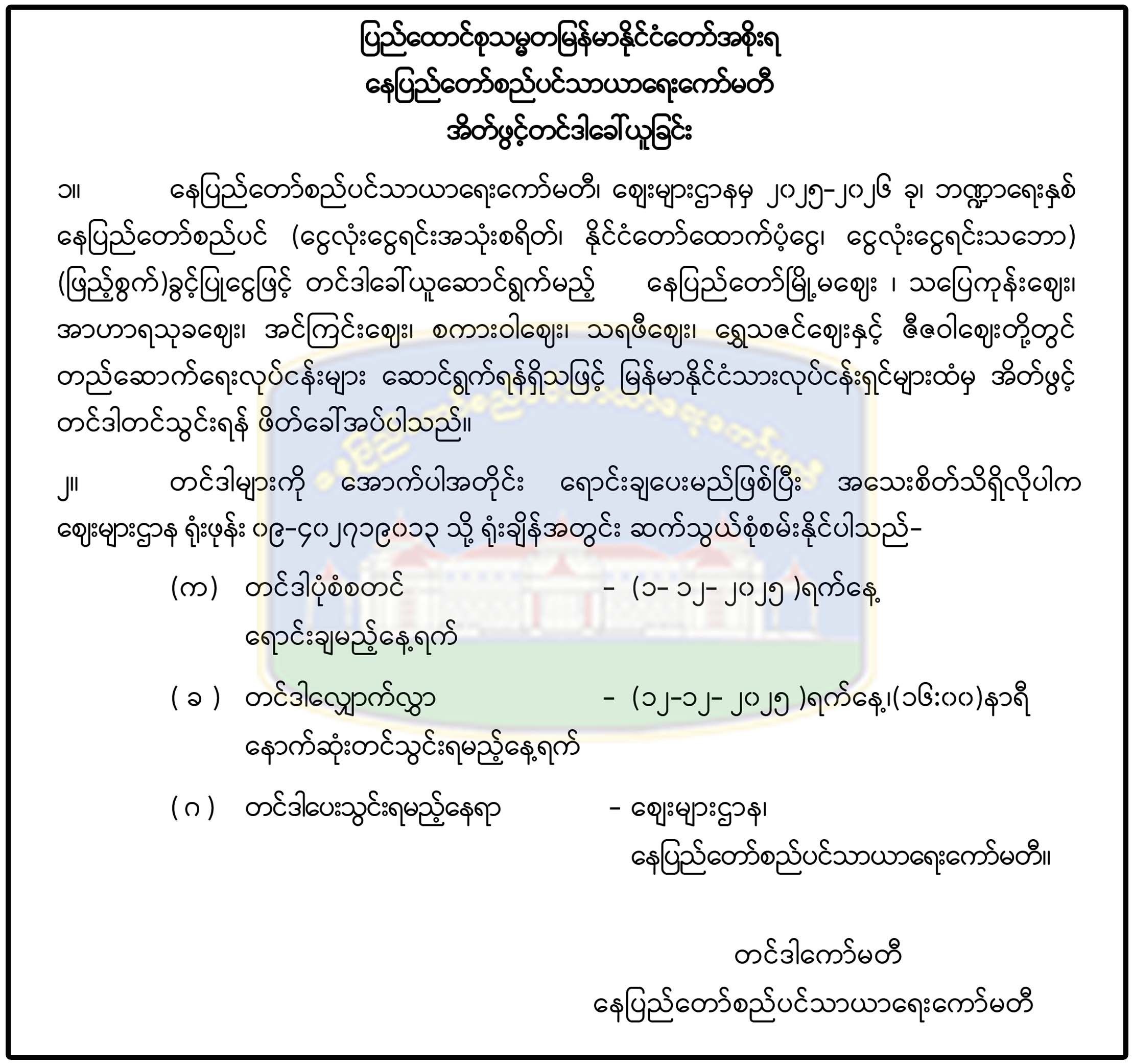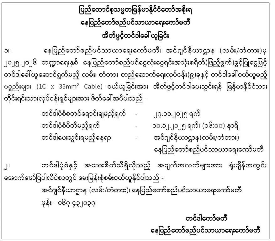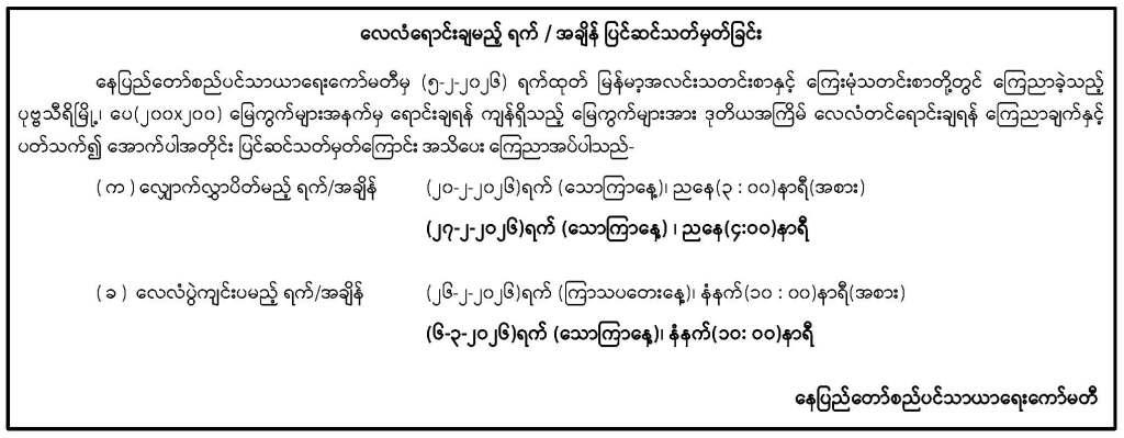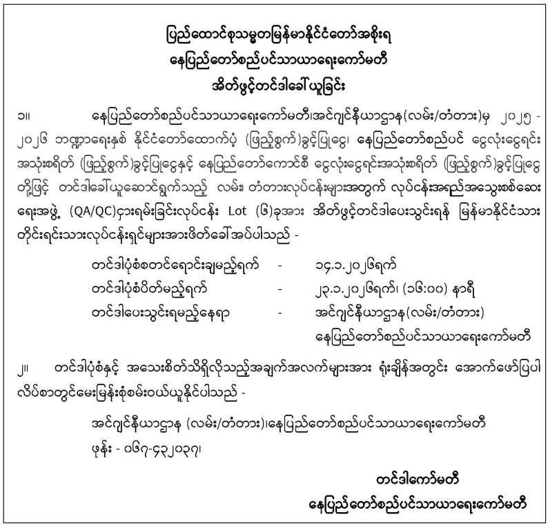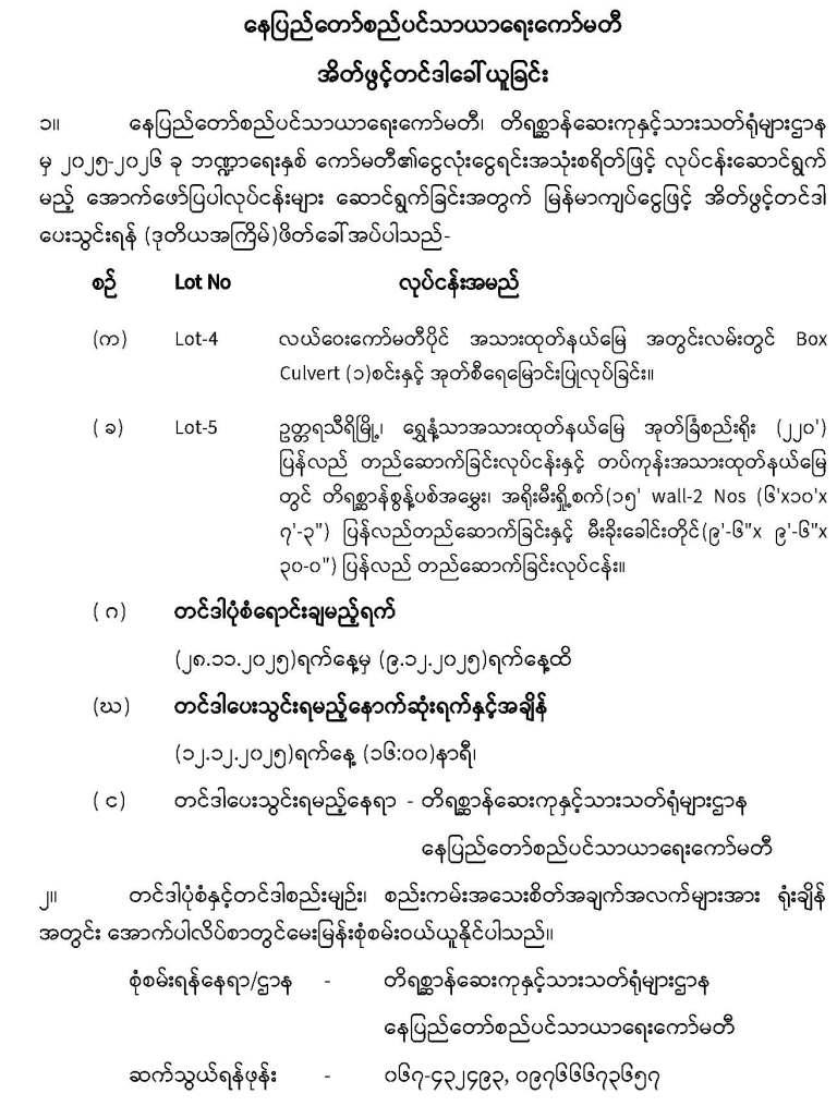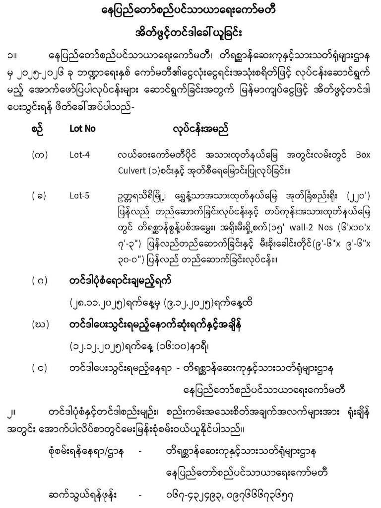 ၁။------- နေပြည်တော်စည်ပင်သာယာရေးကော်မတီ၊ ဈေးများဌာနကွပ်ကဲမှုအောက် ပုဗ္ဗသီရိမြို့နယ်၊ ငုရွှေဝါဈေးတွင် အသစ်ဆောက်လုပ်ပြီးစီးသည့် Steel Structure (10'×12') ကုန်စုံဆိုင်ခန်း (20)ခန်း၊ ဆိုင်ခန်းတန်ဖိုး(၂%) အာမခံစပေါ်ငွေပေးသွင်းပြီး လျှောက်ထားသူ များကို (၂၈.2.2022)ရက်နေ့၊ နံနက်(9:00)နာရီအချိန်မှစ၍ နေပြည်တော်စည်ပင်သာယာရေး ကော်မတီ၊ ဈေးများဌာနအစည်းအဝေးခန်းမ၌ မဲနှိုက်နေရာချထားပေးမည်ဖြစ်ပါသည်။
