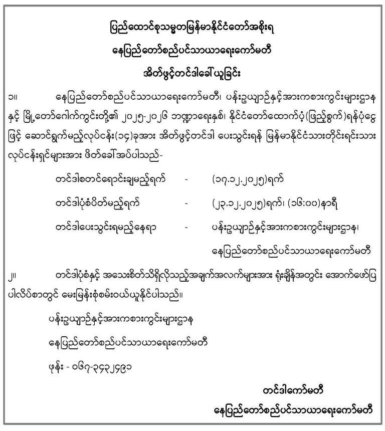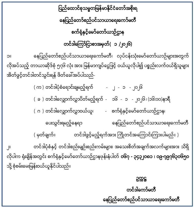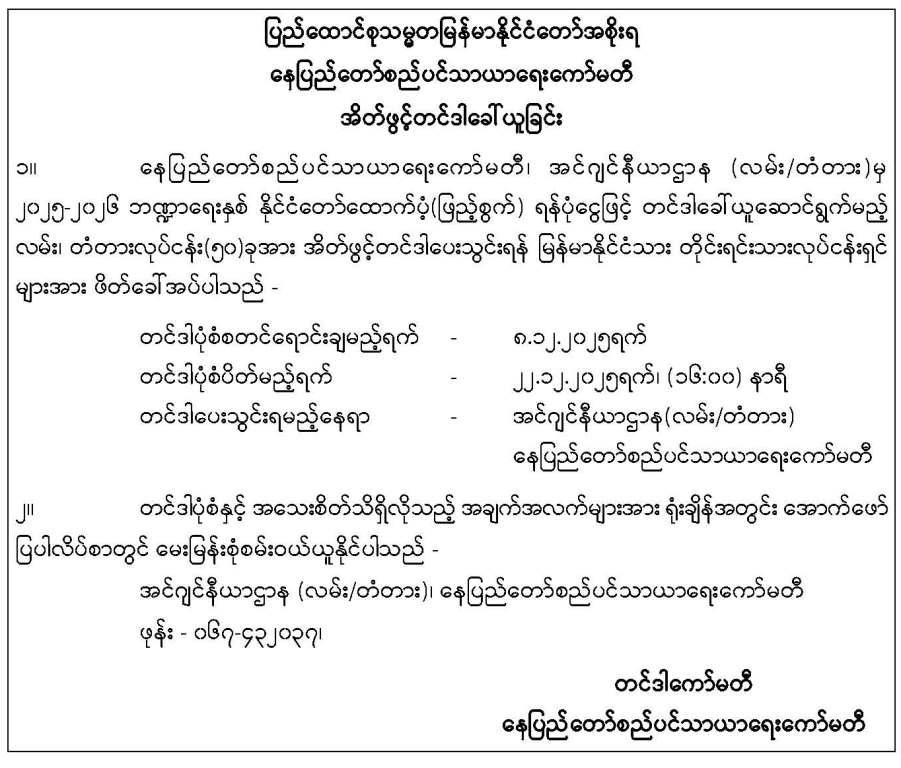 -------နေပြည်တော်၊ ဇမ္ဗူသီရိမြို့နယ်၊ သုခသိဒ္ဓိရပ်ကွက်၊ သုခတော်ဝင်အိမ်ရာရှိ တိုက်အမှတ် (M-2)၊ မြေညီထပ်၊ အခန်း(04)အား အမည်ပေါက်ပိုင်ဆိုင်သူ ဦးတင်ဝင်း၊ နိုင်ငံသားစိစစ်ရေး အမှတ်၊ ၁၂/မရက(နိုင်) ၀၀၆၃၇၈ ထံမှ လွှဲပြောင်းရယူထားသူ ဦးမင်းခန့်ကြည်ဝင်း၊ နိုင်ငံသားစိစစ် ရေးအမှတ်၊ ၁၂/မဂဒ(နိုင်) ၁၃၇၁၉၈ သည် အမည်ပေါက်ပြောင်းလဲပေးပါရန် လျှောက်ထားလာ မှုအား တရားဝင်ခိုင်လုံသောအထောက်အထားများဖြင့် ဤကြော်ငြာစာပါသည့်နေ့မှစ၍ (၁၄)ရက် အတွင်း သုခတော်ဝင်အိမ်ရာစိစစ်နေရာချထားရေးဆပ်ကော်မတီသို့ စာဖြင့်တင်ပြ၍ ကန့်ကွက်နိုင် ပါကြောင်းနှင့် ကန့်ကွက်မှုမရှိပါက လုပ်ထုံးလုပ်နည်းနှင့်အညီ ဆက်လက်ဆောင်ရွက်ပေးမည်ဖြစ်ပါကြောင်း အသိပေးကြေညာအပ်ပါသည်။