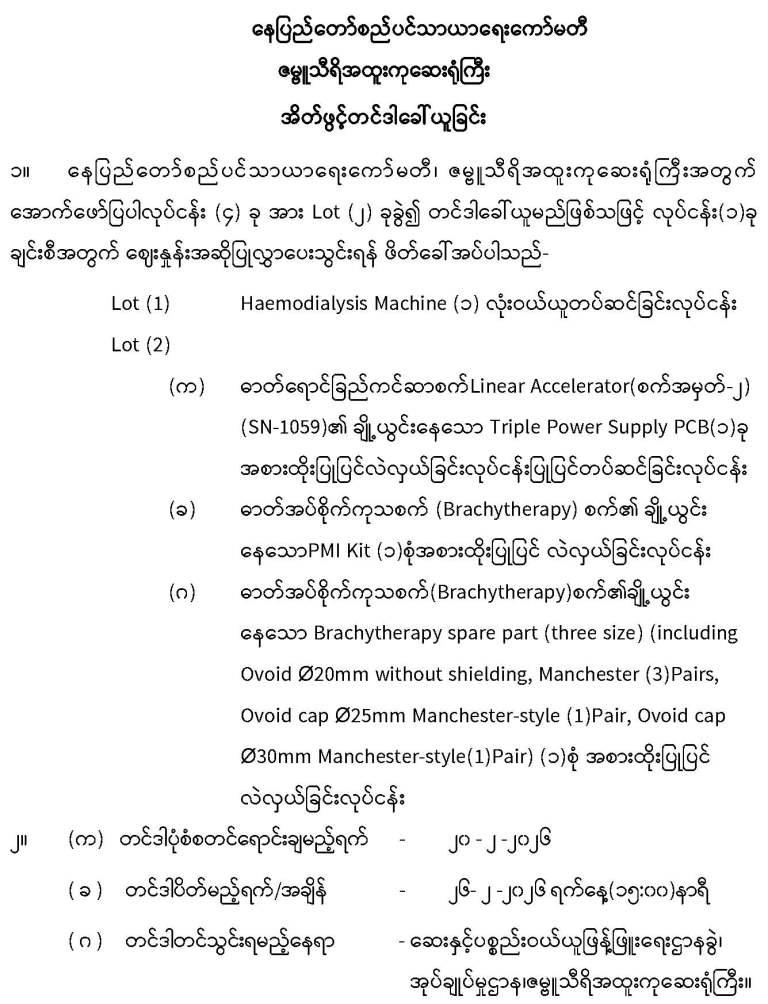 -------၂၀၂၆-၂၀၂၇ ဘဏ္ဍာရေးနှစ် ပျဉ်းမနားမြို့၊ မင်္ဂလာရှမ်းကန်နှင့် ဇမ္ဗူသီရိမြို့၊ မင်္ဂလာကန်တော် အများသုံးအဆင့်မြင့်သန့်စင်ခန်းလိုင်စင်အတွက် ပေးသွင်းရမည့် အာမခံငွေစာရင်းအားwww.nptdc.gov.mm/customized/pdf/23-1-2026(insurance)01.pdf တွင် download ရယူနိုင်ပါသည်။