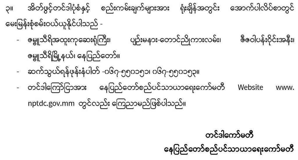 -------၂၀၂၆-၂၀၂၇ ဘဏ္ဍာရေးနှစ် လမ်းဘေးပျံကျဈေးကောက်လိုင်စင်အတွက် ပေးသွင်းရမည့် အာမခံငွေစာရင်းအားwww.nptdc.gov.mm/customized/pdf/23-1-2026(insurance).pdf တွင် download ရယူနိုင်ပါသည်။