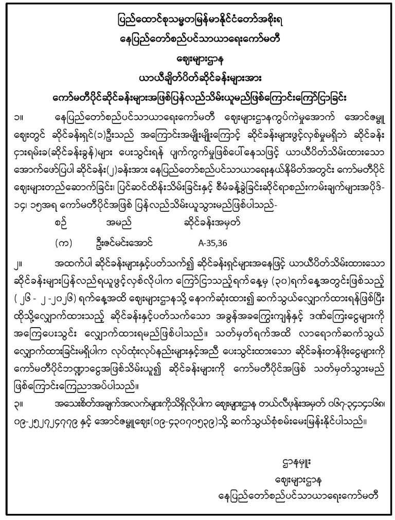 ------- နေပြည်တော်၊ ဇမ္ဗူသီရိမြို့နယ်၊ သုခသိဒ္ဓိရပ်ကွက်၊ ပျဉ်းမနား-တောင်ညိုလမ်းဘေး (မြို့မဈေးအနီး) သုခတော်ဝင်အိမ်ရာရှိ တိုက်အမှတ် (E-3) ၊ မြေညီထပ်၊ အခန်း (04)အား အမည် ပေါက်ပိုင်ဆိုင်သူ ဦးသောင်းထွန်း၊ နိုင်ငံသားစိစစ်ရေးအမှတ်၊ ၁၂/ဥကမ(နိုင်) ၁၇၄၄၀၉ ထံမှ လွှဲပြောင်းရယူထားသူ ဦးရွှေလွန်း၊ နိုင်ငံသားစိစစ်ရေးအမှတ်၊ ၆/မအရ(နိုင်) ၀၁၂၄၃၃ မှ အမည်ပေါက် ပြောင်းလဲပေးပါရန် လျှောက်ထားလာမှုအား တရားဝင်ခိုင်လုံသော အထောက်အထားများဖြင့် ဤကြော်ငြာစာပါသည့်နေ့မှစ၍ (၁၄)ရက်အတွင်း သုခတော်ဝင်အိမ်ရာ စိစစ်နေရာချထားရေး ဆပ်ကော်မတီသို့တင်ပြ၍ ကန့်ကွက်နိုင်ပါကြောင်းနှင့်ကန့်ကွက်မှုမရှိပါက လုပ်ထုံးလုပ်နည်းနှင့် အညီ ဆက်လက်ဆောင်ရွက်ပေးမည်ဖြစ်ပါကြောင်း အသိပေးကြေညာအပ်ပါသည်။