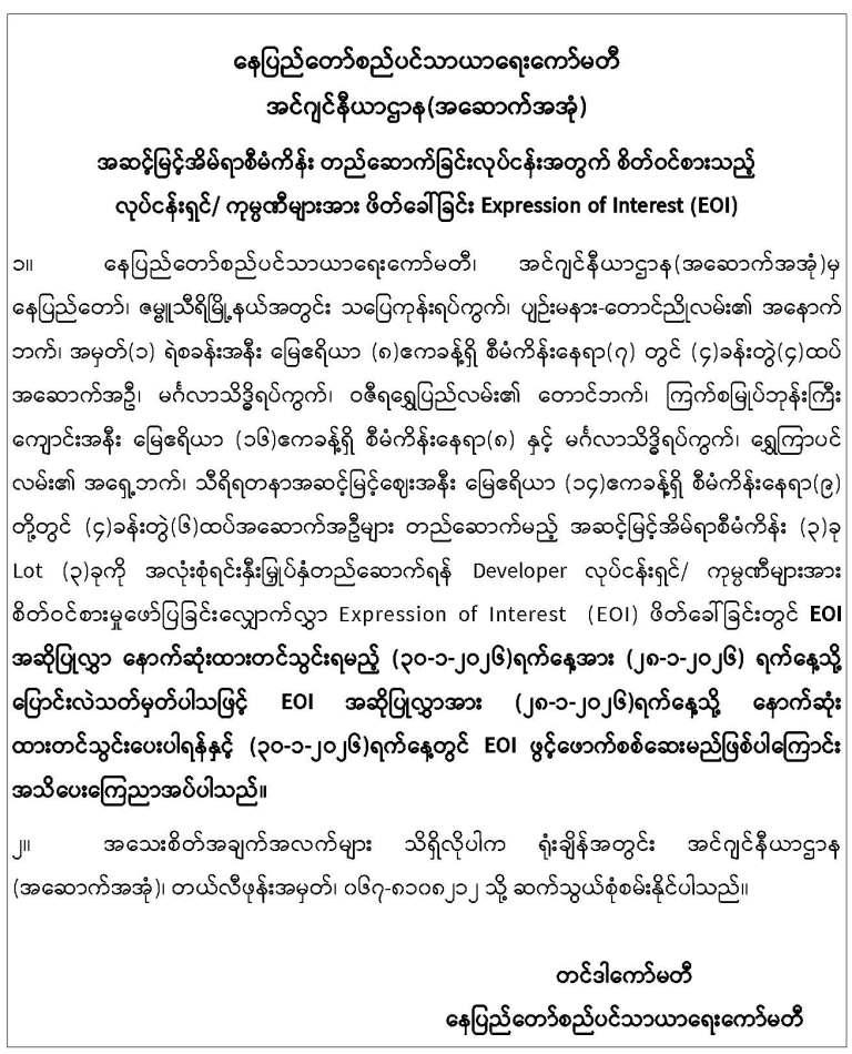 -------နေပြည်တော်၊ ဇမ္ဗူသီရိမြို့နယ်၊ သုခသိဒ္ဓိရပ်ကွက်၊ ပျဉ်းမနား-တောင်ညိုလမ်းဘေး (မြို့မဈေးအနီး)သုခတော်ဝင်အိမ်ရာရှိ တိုက်အမှတ်(F-5)၊ မြေညီထပ်၊အခန်း(02)အား အမည်ပေါက် ပိုင်ဆိုင်သူ ဦးကျော်(ခ)ဦးကျော်ကျော်၊ နိုင်ငံသားစိစစ်ရေးအမှတ် ၇/ကဝန(နိုင်)၀၀၉၃၂၁ ထံမှ လွှဲပြောင်းရယူထားသူ ဦးကျော်သီဟ၊ နိုင်ငံသားစိစစ်ရေးအမှတ် ၁၄/အမန(နိုင်)၀၉၂၅၀၀ မှ အမည်ပေါက် ပြောင်းလဲပေးပါရန် လျှောက်ထားလာမှုအား တရားဝင်ခိုင်လုံသော အထောက် အထားများဖြင့် ဤကြော်ငြာစာပါသည့်နေ့မှစ၍ (၁၄)ရက်အတွင်း သုခတော်ဝင်အိမ်ရာစိစစ် နေရာချထားရေး ဆပ်ကော်မတီသို့ တင်ပြ၍ကန့်ကွက်နိုင်ပါကြောင်းနှင့် ကန့်ကွက်မှုမရှိပါက လုပ်ထုံးလုပ်နည်းနှင့်အညီ ဆက်လက်ဆောင်ရွက်ပေးမည်ဖြစ်ပါကြောင်း အသိပေးကြေညာအပ် ပါသည်။