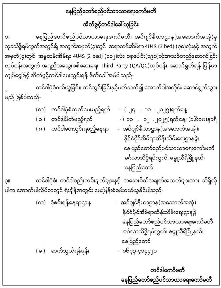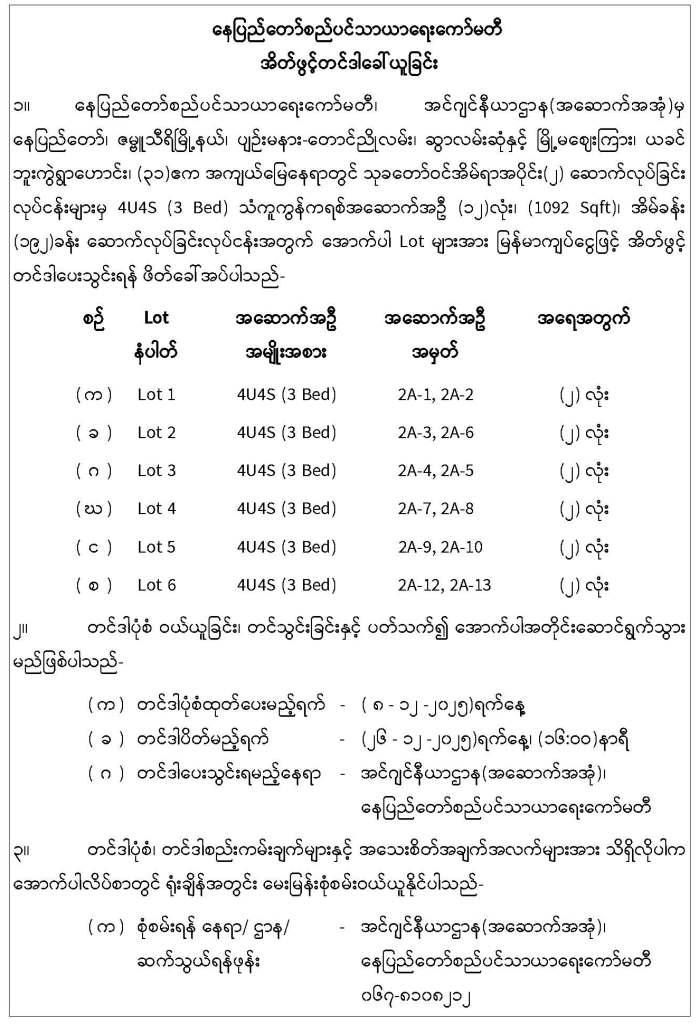 -------နေပြည်တော်၊ ဇမ္ဗူသီရိမြို့နယ်၊ သုခသိဒ္ဓိရပ်ကွက်၊ သုခတော်ဝင်အိမ်ရာရှိ တိုက်အမှတ် (W-10)၊ မြေညီထပ်၊ အခန်း(02)အား အမည်ပေါက်ပိုင်ဆိုင်သူ ဒေါ်အေးအေးဝင်း၊ နိုင်ငံသားစိစစ် ရေးအမှတ်၊ ၁၂/လမန(နိုင်) ၀၀၄၈၉၄ ထံမှ လွှဲပြောင်းရယူထားသူ ဒေါ်ဖြူဖြူခိုင်၊ နိုင်ငံသားစိစစ်ရေး အမှတ်၊ ၈/မကန(နိုင်) ၂၃၃၅၀၂ သည် အမည်ပေါက်ပြောင်းလဲပေးပါရန် လျှောက်ထားလာမှုအား တရားဝင်ခိုင်လုံသောအထောက်အထားများဖြင့် ဤကြော်ငြာစာပါသည့်နေ့မှစ၍ (၁၄)ရက်အတွင်း သုခတော်ဝင်အိမ်ရာစိစစ်နေရာချထားရေးဆပ်ကော်မတီသို့စာဖြင့်တင်ပြ၍ ကန့်ကွက်နိုင်ပါကြောင်း နှင့် ကန့်ကွက်မှုမရှိပါက လုပ်ထုံးလုပ်နည်းနှင့်အညီ ဆက်လက်ဆောင်ရွက်ပေးမည်ဖြစ်ပါကြောင်း အသိပေးကြေညာအပ်ပါသည်။