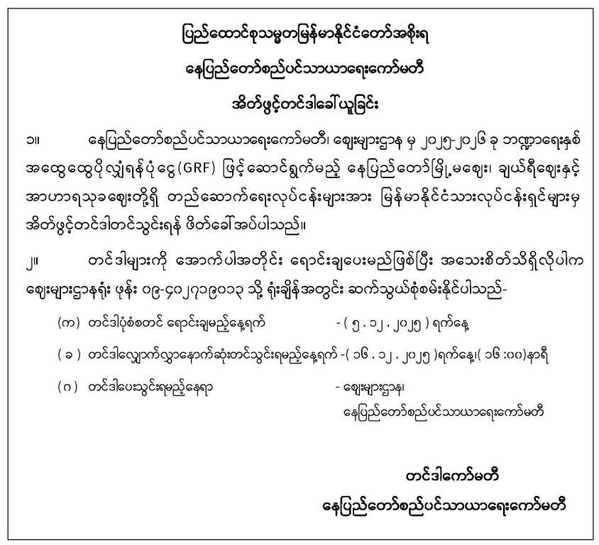 -------နေပြည်တော်၊ ဇမ္ဗူသီရိမြို့နယ်၊ သုခသိဒ္ဓိရပ်ကွက်၊ သုခတော်ဝင်အိမ်ရာရှိ တိုက်အမှတ် (M-5)၊ ဒုတိယထပ်၊ အခန်း(21)အား အမည်ပေါက်ပိုင်ဆိုင်သူ ဦးသိန်းကျော်၊ နိုင်ငံသားစိစစ်ရေး အမှတ်၊ ၉/မနမ(နိုင်) ၁၀၅၆၆၇ ထံမှ လွှဲပြောင်းရယူထားသူ ဦးထွန်းမောင်၊ နိုင်ငံသားစိစစ်ရေး အမှတ်၊ ၁၃/နစန(နိုင်) ၀၀၂၄၅၆ မှ အမည်ပေါက်ပြောင်းလဲပေးပါရန် လျှောက်ထားလာမှုအား တရားဝင်ခိုင်လုံသောအထောက်အထားများဖြင့် ဤကြော်ငြာစာပါသည့်နေ့မှစ၍ (၁၄)ရက်အတွင်း သုခတော်ဝင်အိမ်ရာစိစစ်နေရာချထားရေးဆပ်ကော်မတီသို့စာဖြင့်တင်ပြ၍ ကန့်ကွက်နိုင်ပါကြောင်း နှင့် ကန့်ကွက်မှုမရှိပါက လုပ်ထုံးလုပ်နည်းနှင့်အညီ ဆက်လက်ဆောင်ရွက်ပေးမည်ဖြစ်ပါကြောင်း အသိပေးကြေညာအပ်ပါသည်။