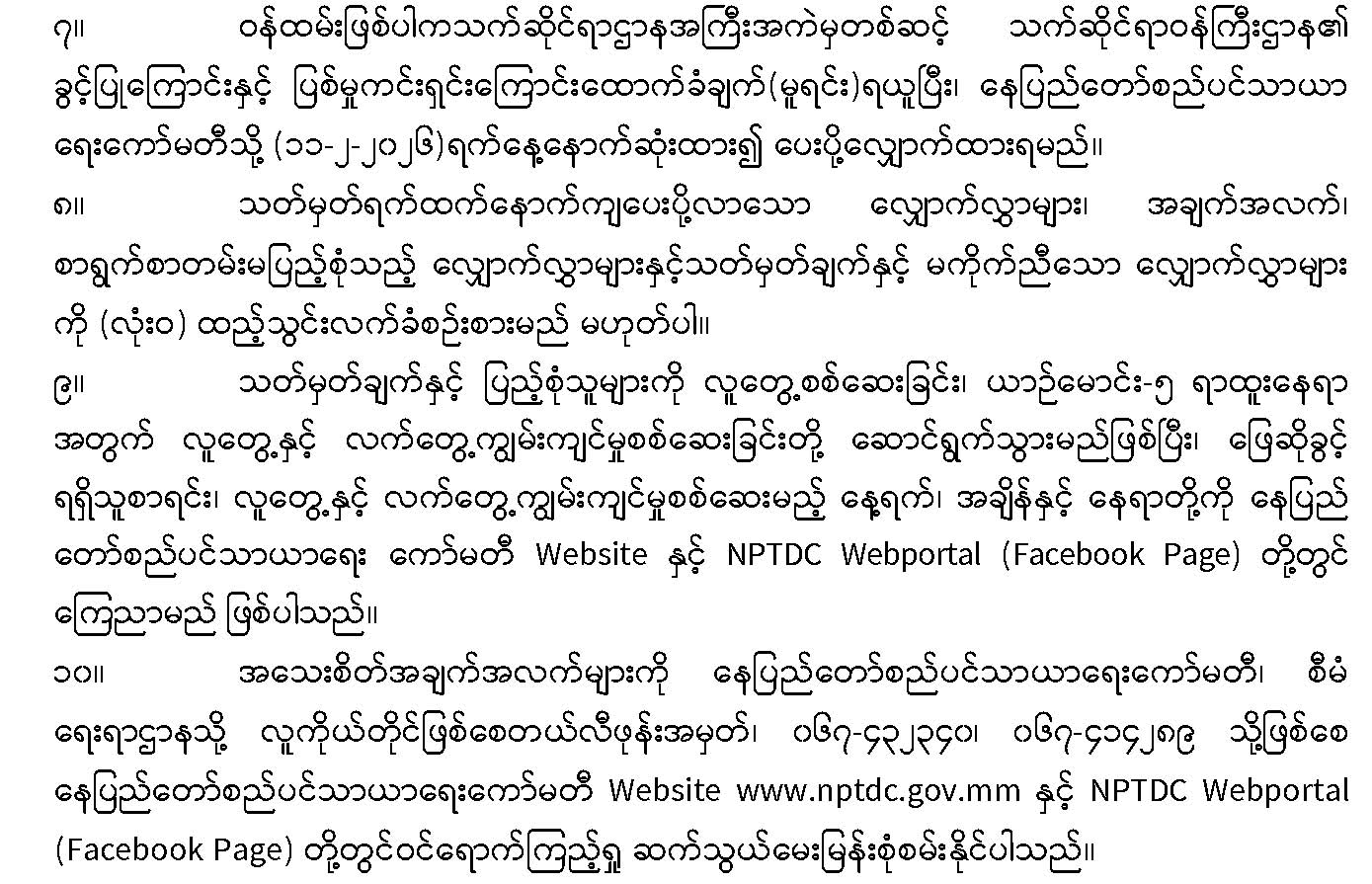 -------၂၀၂၆-၂၀၂၇ ဘဏ္ဍာရေးနှစ် လမ်းဘေးပျံကျဈေးကောက်လိုင်စင်အတွက် ပေးသွင်းရမည့် အာမခံငွေစာရင်းအားwww.nptdc.gov.mm/customized/pdf/23-1-2026(insurance).pdf တွင် download ရယူနိုင်ပါသည်။