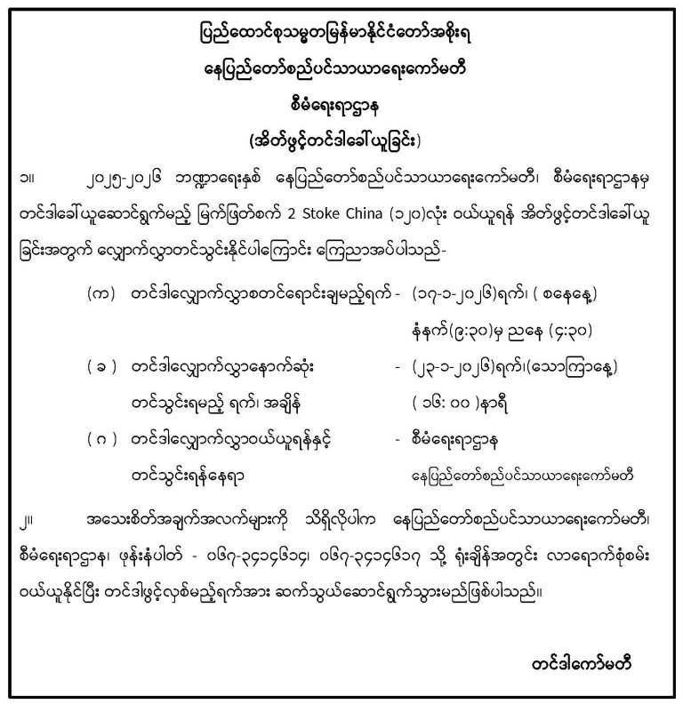အင်ဂျင်နီယာဌာန(ရေနှင့်သန့်ရှင်းမှု)မှ အသိပေးကြေညာခြင်း