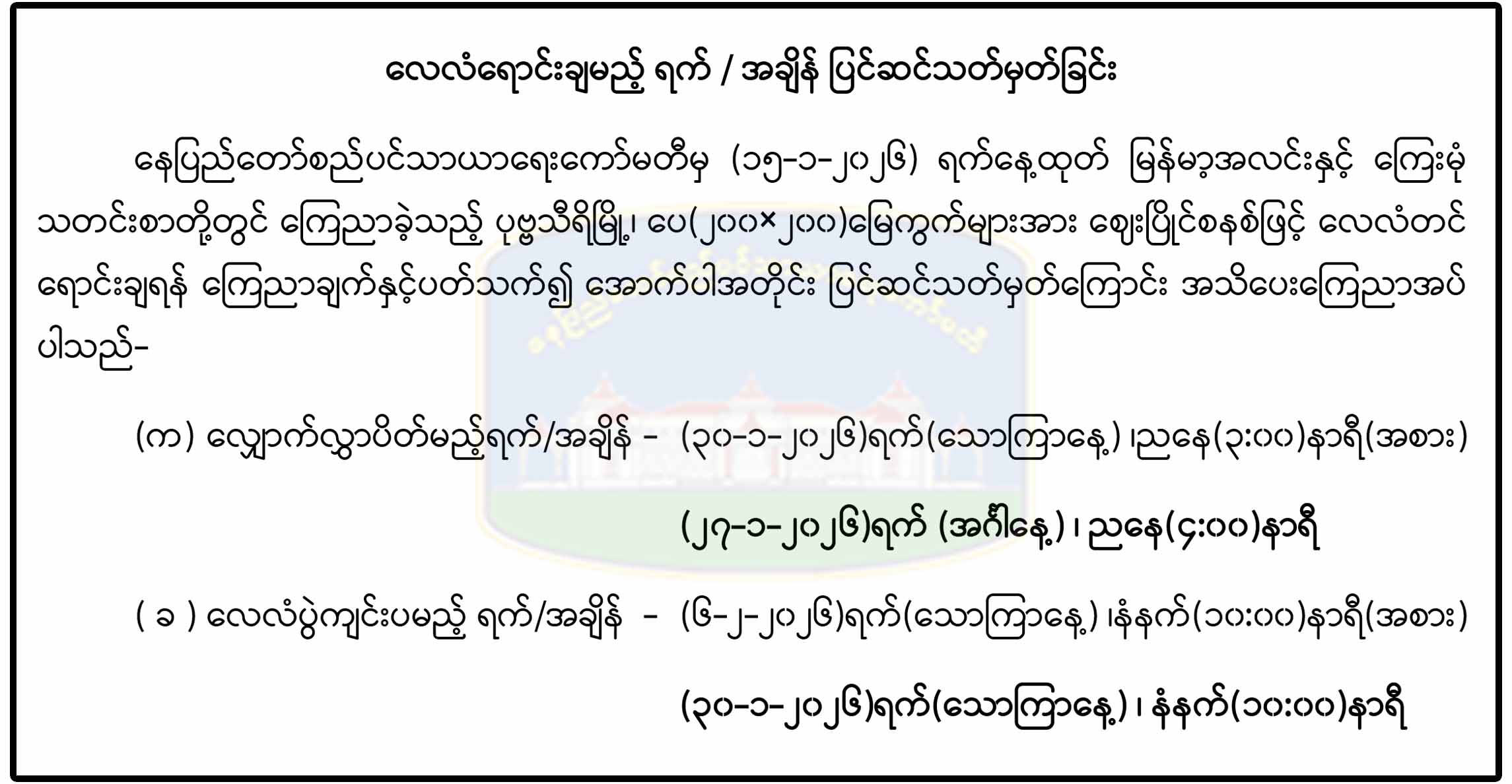 ------- နေပြည်တော်၊ ဇမ္ဗူသီရိမြို့နယ်၊ သုခသိဒ္ဓိရပ်ကွက်၊ ပျဉ်းမနား-တောင်ညိုလမ်းဘေး (မြို့မဈေးအနီး) သုခတော်ဝင်အိမ်ရာရှိ တိုက်အမှတ် (E-3) ၊ မြေညီထပ်၊ အခန်း (04)အား အမည် ပေါက်ပိုင်ဆိုင်သူ ဦးသောင်းထွန်း၊ နိုင်ငံသားစိစစ်ရေးအမှတ်၊ ၁၂/ဥကမ(နိုင်) ၁၇၄၄၀၉ ထံမှ လွှဲပြောင်းရယူထားသူ ဦးရွှေလွန်း၊ နိုင်ငံသားစိစစ်ရေးအမှတ်၊ ၆/မအရ(နိုင်) ၀၁၂၄၃၃ မှ အမည်ပေါက် ပြောင်းလဲပေးပါရန် လျှောက်ထားလာမှုအား တရားဝင်ခိုင်လုံသော အထောက်အထားများဖြင့် ဤကြော်ငြာစာပါသည့်နေ့မှစ၍ (၁၄)ရက်အတွင်း သုခတော်ဝင်အိမ်ရာ စိစစ်နေရာချထားရေး ဆပ်ကော်မတီသို့တင်ပြ၍ ကန့်ကွက်နိုင်ပါကြောင်းနှင့်ကန့်ကွက်မှုမရှိပါက လုပ်ထုံးလုပ်နည်းနှင့် အညီ ဆက်လက်ဆောင်ရွက်ပေးမည်ဖြစ်ပါကြောင်း အသိပေးကြေညာအပ်ပါသည်။