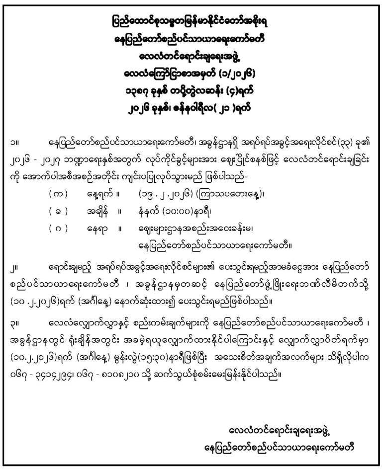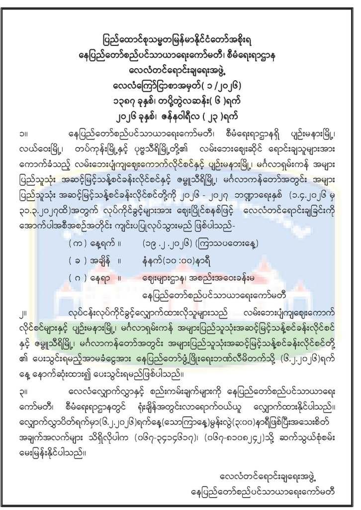 အာမခံစပေါ်ငွေ ပေးသွင်းပြီး လျှောက်ထားသူများကို မဲနှိုက်မည့် အစီအစဉ်အား သိရှိစေရန် ကြေညာခြင်း