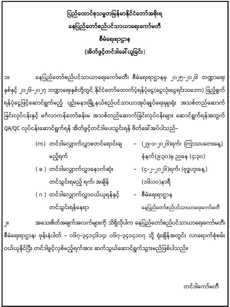 -------၂၀၂၆-၂၀၂၇ ဘဏ္ဍာရေးနှစ် ပျဉ်းမနားမြို့၊ မင်္ဂလာရှမ်းကန်နှင့် ဇမ္ဗူသီရိမြို့၊ မင်္ဂလာကန်တော် အများသုံးအဆင့်မြင့်သန့်စင်ခန်းလိုင်စင်အတွက် ပေးသွင်းရမည့် အာမခံငွေစာရင်းအားwww.nptdc.gov.mm/customized/pdf/23-1-2026(insurance)01.pdf တွင် download ရယူနိုင်ပါသည်။