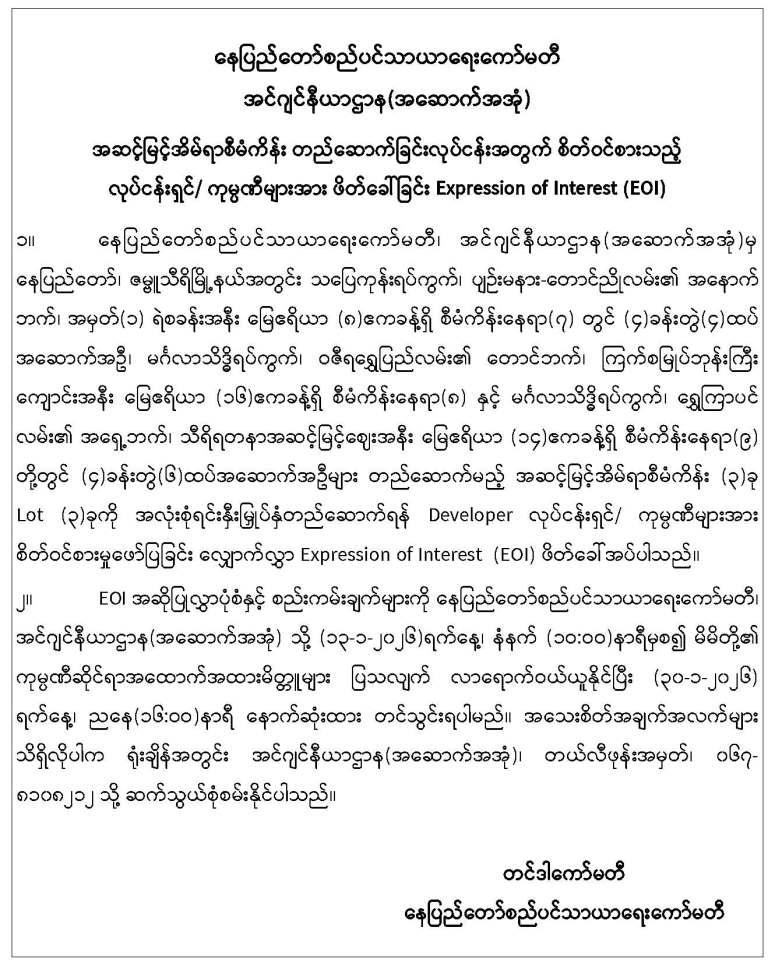 -------နေပြည်တော်၊ ဇမ္ဗူသီရိမြို့နယ်၊ သုခသိဒ္ဓိရပ်ကွက်၊ သုခတော်ဝင်အိမ်ရာရှိ တိုက်အမှတ် (V-3)၊ တတိယထပ်၊ အခန်း(31)အား အမည်ပေါက်ပိုင်ဆိုင်သူ ဒေါ်သီတာစိုး၊ နိုင်ငံသားစိစစ်ရေး အမှတ်၊ ၉/ပသက(နိုင်)၁၀၈၄၁၈ ထံမှ လွှဲပြောင်းရယူထားသူ ဒေါ်ြမတ်မြတ်ထွေး၊ နိုင်ငံသားစိစစ်ရေး အမှတ်၊ ၁၃/ကမန(နိုင်) ၀၀၀၆၉၂ သည် အမည်ပေါက်ပြောင်းလဲပေးပါရန် လျှောက်ထားလာမှုအား တရားဝင်ခိုင်လုံသော အထောက်အထားများဖြင့် ဤကြော်ငြာစာပါသည့်နေ့မှစ၍ (၁၄)ရက်အတွင်း သုခတော်ဝင်အိမ်ရာ စိစစ်နေရာချထားရေးဆပ်ကော်မတီသို့စာဖြင့်တင်ပြ၍ ကန့်ကွက်နိုင်ပါကြောင်း နှင့် ကန့်ကွက်မှုမရှိပါက လုပ်ထုံးလုပ်နည်းနှင့်အညီ ဆက်လက်ဆောင်ရွက်ပေးမည်ဖြစ်ပါကြောင်း အသိပေးကြေညာအပ်ပါသည်။