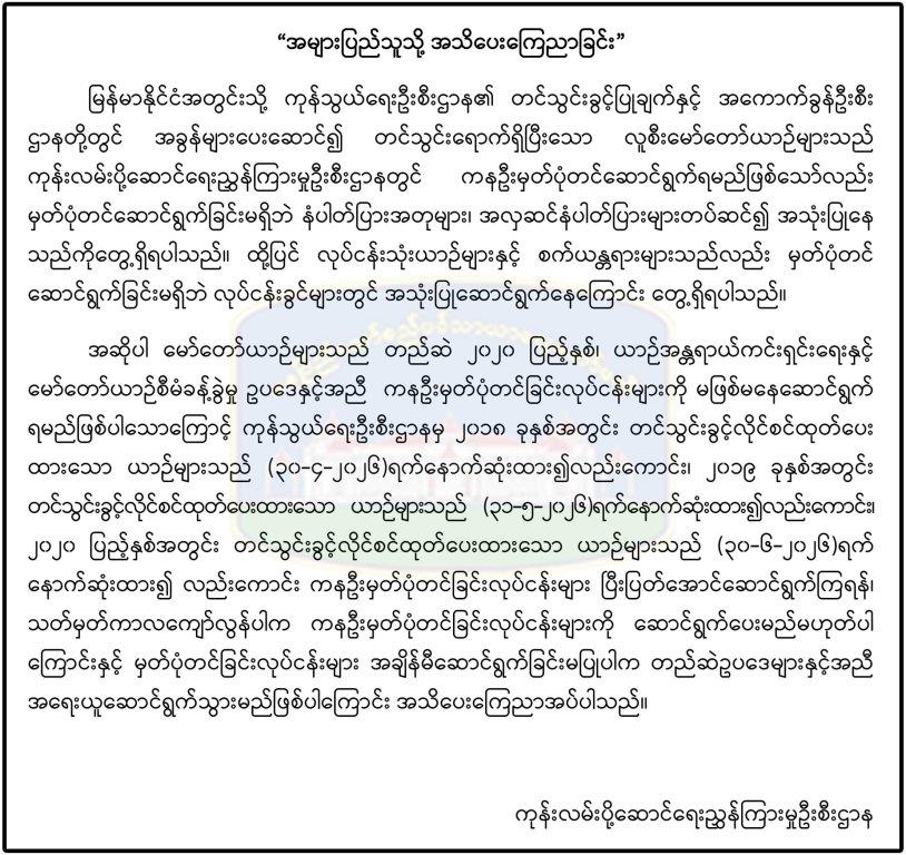 ------- နေပြည်တော်ဖွံ့ဖြိုးရေးဘဏ်လီမိတက်မှ အငှားဝယ်ချေးငွေရယူ၍ ဝယ်ယူခဲ့သည့် မော်တော်ယာဉ်များနှင့်သက်ဆိုင်သောစာချုပ်စာတမ်းများနှင့် ယာဉ်မှတ်ပုံတင်စာအုပ်(Owner Book) မူရင်းများသည် နေပြည်တော်ဖွံ့ဖြိုးရေးဘဏ်လီမိတက်တွင် အာမခံအဖြစ် တည်ရှိလျက်ရှိသည့်အပြင် အငှားဝယ်ယူသူနှင့် ဘဏ်တို့ ချုပ်ဆိုခဲ့သည့် ကတိစာချုပ်များအရ မော်တော်ယာဉ်များသည် ဘဏ်၏ပိုင်ဆိုင်မှုပစ္စည်းအဖြစ် တည်ရှိလျှက်ရှိသည့်အတွက် နေပြည်တော်ဖွံ့ဖြိုးရေးဘဏ်မှ မော်တော်ယာဉ်များအား ပြန်လည်သိမ်းဆည်းသွားမည် ဖြစ်ပါသည်။ သို့ဖြစ်ပါ၍ အငှားဝယ်ချေးငွေရယူပြီး မော်တော်ယာဉ်လက်ဝယ်ရှိသူများနှင့် အကြောင်းအမျိုးမျိုးဖြင့် မော်တော်ယာဉ်လက်ဝယ်ရှိသူများသည် မိမိတို့လက်ဝယ်ရှိ မော်တော်ယာဉ်များနှင့် ပတ်သက်၍ ပိုင်ဆိုင်မှုခိုင်မာစေရေး အငှားဝယ်ချေးငွေကြွေးကျန်များအား ပြေကြေစွာ ပြန်လည် ပေးဆပ်သွားရန်နှင့် ချေးငွေပြေကြေခြင်းမရှိသည့် အငှားဝယ်မော်တော်ယာဉ်များအား ပဋိညာဉ် စာချုပ်ပါ စည်းကမ်းချက်များနှင့်အညီ သိမ်းဆည်းသွားမည်ဖြစ်ပါကြောင်း ထပ်မံ၍ အသိပေး ကြေညာအပ်ပါသည်။