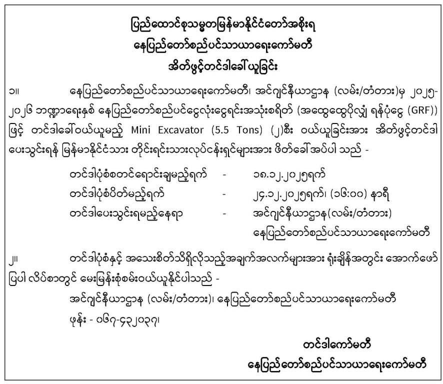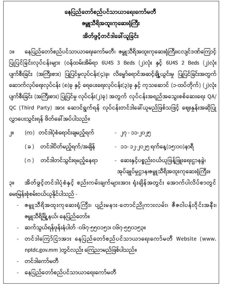 ၁။------- နေပြည်တော်စည်ပင်သာယာရေးကော်မတီ၊ ဈေးများဌာနကွပ်ကဲမှုအောက် ပုဗ္ဗသီရိမြို့နယ်၊ ငုရွှေဝါဈေးတွင် အသစ်ဆောက်လုပ်ပြီးစီးသည့် Steel Structure (10'×12') ကုန်စုံဆိုင်ခန်း (20)ခန်း၊ ဆိုင်ခန်းတန်ဖိုး(၂%) အာမခံစပေါ်ငွေပေးသွင်းပြီး လျှောက်ထားသူ များကို (၂၈.2.2022)ရက်နေ့၊ နံနက်(9:00)နာရီအချိန်မှစ၍ နေပြည်တော်စည်ပင်သာယာရေး ကော်မတီ၊ ဈေးများဌာနအစည်းအဝေးခန်းမ၌ မဲနှိုက်နေရာချထားပေးမည်ဖြစ်ပါသည်။