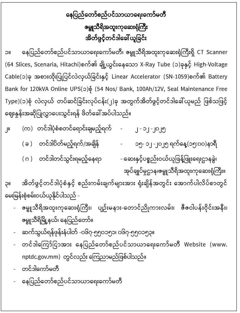 ------- နေပြည်တော်ဖွံ့ဖြိုးရေးဘဏ်လီမိတက်မှ အငှားဝယ်ချေးငွေရယူ၍ ဝယ်ယူခဲ့သည့် မော်တော် ယာဉ်များနှင့် သက်ဆိုင်သော စာချုပ်စာတမ်းများနှင့် ယာဉ်မှတ်ပုံတင်စာအုပ်(Owner Book) မူရင်းများသည် နေပြည်တော်ဖွံ့ဖြိုးရေးဘဏ်လီမိတက်တွင် အာမခံအဖြစ် တည်ရှိလျက်ရှိသည့်အပြင် အငှားဝယ်ယူ သူနှင့် ဘဏ်တို့ ချုပ်ဆိုခဲ့သည့် ကတိစာချုပ်များအရ မော်တော်ယာဉ်များသည် ဘဏ်၏ ပိုင်ဆိုင်မှုပစ္စည်း အဖြစ်တည်ရှိကြောင်း (၇)ကြိမ်ထိ ကြေညာခဲ့ပြီး ဖြစ်ပါသည်။သို့ဖြစ်ပါ၍ အငှားဝယ်ချေးငွေရယူပြီး မော်တော်ယာဉ်လက်ဝယ်ရှိသူများနှင့် အကြောင်း အမျိုးမျိုးဖြင့် မော်တော်ယာဉ်လက်ဝယ်ရှိသူများသည် မိမိတို့လက်ဝယ်ရှိမော်တော်ယာဉ်များနှင့် ပတ်သက်၍ ပိုင်ဆိုင်မှုခိုင်မာ စေရေးအတွက် အငှားဝယ်ချေးငွေကြွေးကျန်များအား ၂၀၂၅ ခုနှစ်၊ အောက်တိုဘာလ နောက်ဆုံးထား၍ ပြေကြေစွာ ပြန်လည်ပေးဆပ်သွားရန်နှင့် ချေးငွေပြေကြေခြင်း မရှိသည့် အငှားဝယ်မော်တော်ယာဉ်များအား နိုဝင်ဘာလမှ စတင်၍ ပဋိညာဉ်စာချုပ်ပါ စည်းကမ်းချက် များနှင့်အညီ ပြန်လည်သိမ်းဆည်းသွားမည်ဖြစ်ပါကြောင်း နောက်ဆုံးအကြိမ် အသိပေးကြေညာအပ်ပါသည်။