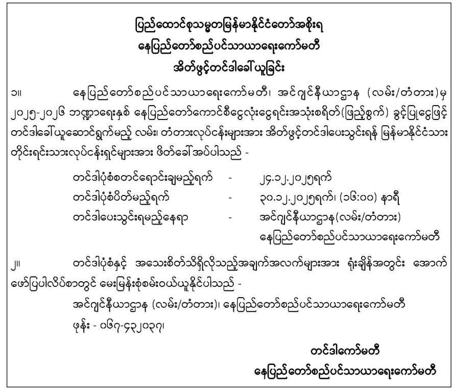 -------နေပြည်တော်၊ ဇမ္ဗူသီရိမြို့နယ်၊ သုခသိဒ္ဓိရပ်ကွက်၊ သုခတော်ဝင်အိမ်ရာရှိ တိုက်အမှတ် (M-2)၊ မြေညီထပ်၊ အခန်း(04)အား အမည်ပေါက်ပိုင်ဆိုင်သူ ဦးတင်ဝင်း၊ နိုင်ငံသားစိစစ်ရေး အမှတ်၊ ၁၂/မရက(နိုင်) ၀၀၆၃၇၈ ထံမှ လွှဲပြောင်းရယူထားသူ ဦးမင်းခန့်ကြည်ဝင်း၊ နိုင်ငံသားစိစစ် ရေးအမှတ်၊ ၁၂/မဂဒ(နိုင်) ၁၃၇၁၉၈ သည် အမည်ပေါက်ပြောင်းလဲပေးပါရန် လျှောက်ထားလာ မှုအား တရားဝင်ခိုင်လုံသောအထောက်အထားများဖြင့် ဤကြော်ငြာစာပါသည့်နေ့မှစ၍ (၁၄)ရက် အတွင်း သုခတော်ဝင်အိမ်ရာစိစစ်နေရာချထားရေးဆပ်ကော်မတီသို့ စာဖြင့်တင်ပြ၍ ကန့်ကွက်နိုင် ပါကြောင်းနှင့် ကန့်ကွက်မှုမရှိပါက လုပ်ထုံးလုပ်နည်းနှင့်အညီ ဆက်လက်ဆောင်ရွက်ပေးမည်ဖြစ်ပါကြောင်း အသိပေးကြေညာအပ်ပါသည်။
