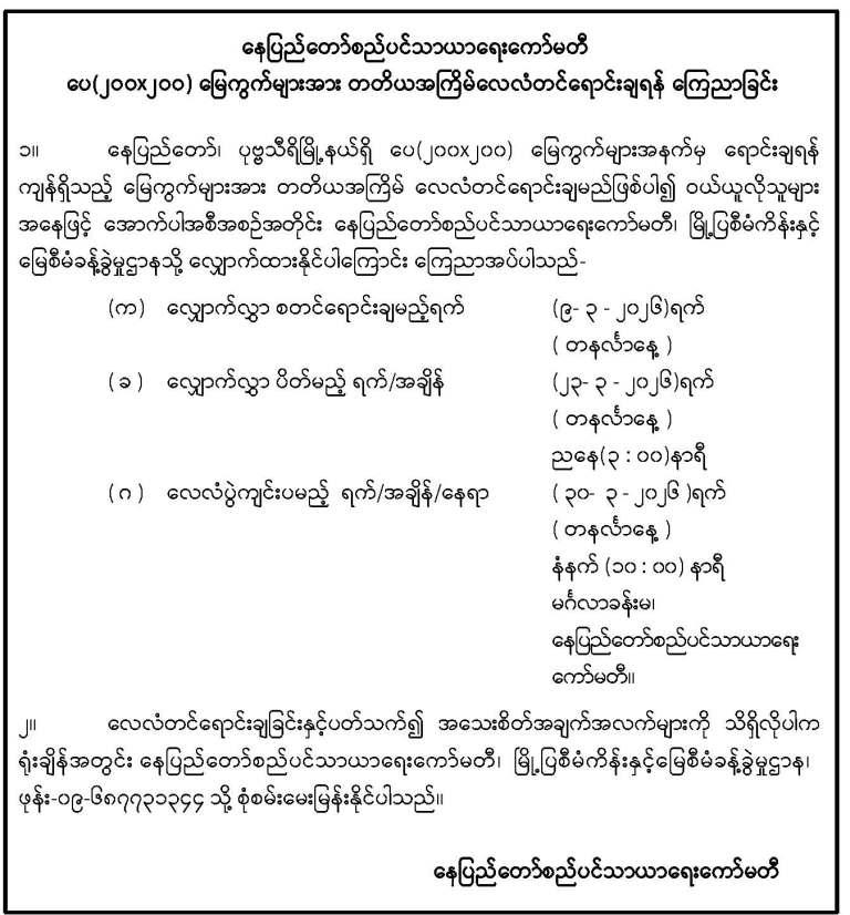 -------၂၀၂၆-၂၀၂၇ ဘဏ္ဍာရေးနှစ်အတွက်(ဒုတိယအကြိမ်) အရပ်ရပ်အခွင့်အရေးလိုင်စင်များ၏ ပေးသွင်းရမည့် အာမခံငွေစာရင်းအားwww.nptdc.gov.mm/customized/pdf/23-2-2026(insurance).pdf တွင် download ရယူနိုင်ပါသည်။